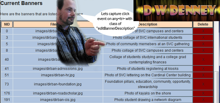 learn more...I have a table of data, and the user needs to be able to edit the “Description” Field. Rather than take the user away from this ui view, I wish to enable “Inline Editing” like many powerful applications are offering these days... The first step is to assign functions to the correct fields and capture the users input events. The user would click on the field to select it, so lets set up a doc delegate event to capture a click on the description field...