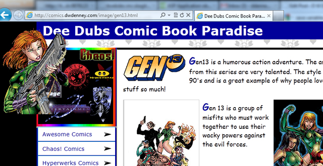 learn moreThe capstone project for completing my Associate of Technical Arts Degree in Multimedia Information Technology was a website. The project was made in HTML and features Flash animation, a Spry menu bar and accordion, custom CSS and JavaScript. The website contains graphics and text describing characters from comic books.